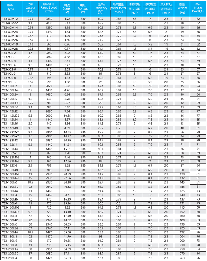 YE3系列(中心高H80-355mm、0.55-375kw)電動機(jī)是全封閉、自扇風(fēng)冷式鼠籠型三相異步電動機(jī),產(chǎn)品能效與EC60034-30的IE3保持一致。一般電壓為380V、頻率為50Hz也可按客戶要求定制。工作環(huán)境-15-40°C,海拔不超過1000M,絕緣等級F(B極考核)防護(hù)等級IP55、冷卻方式IC411、工作制S1、安裝方式符合IEC和DIN標(biāo)準(zhǔn)。