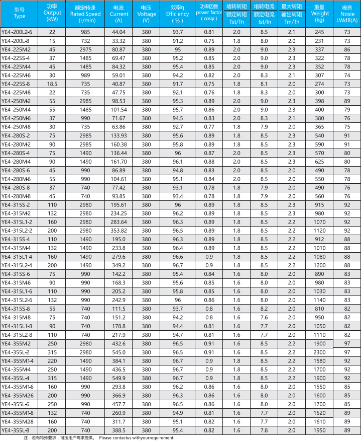 YE4系列(中心高H80-355mm、0.55-375kW)電動機是全封閉、自扇風冷式鼠籠型三相異步電動機,產品能效與IEC60034-30的IE4保持一致。一般電壓為380V、頻率為50HZ也可按客戶要求定制。工作環(huán)境-15-40℃海拔不超過1000m,絕緣等級F(B極考核)、防護等級IP55、冷卻方式IC411、工作制S1、安裝方式符合IEC和DIN標準。YE4系列電動機為一般用途的電動機,適用于驅動無特殊要求的各種機械設備。YE4系列電動機滿足GB18613-2020能效限值2級。