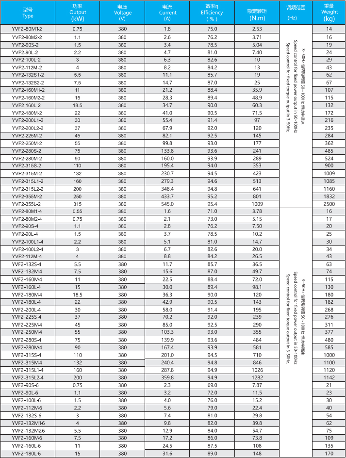 YVF2系列電機(jī)是可以采用變頻器供電的三相異步電動(dòng)機(jī),是電機(jī)節(jié)能的一種典型應(yīng)用,采用特殊的絕緣系統(tǒng)吏其能適用于變頻器供電系統(tǒng),一般額定電壓380V,頻率50Hz,5~50Hz為恒轉(zhuǎn)矩,50~100Hz為恒功率,也可根據(jù)用戶要求確定額定點(diǎn)的電壓和頻率,防護(hù)等級(jí)IP55、冷卻方式IC416、安裝方式符合IEC和DIN標(biāo)準(zhǔn)。
